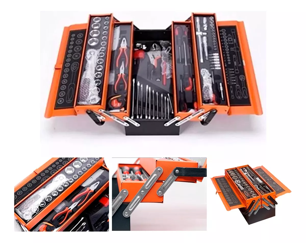 Características del Producto 12 llaves comb. 6 8 9 10 11 12 13 14 15 16 17 19 mm 12 Tubos 1/4 4 4.5 5 5.5 6 7 8 9 10 11 12 13 mm 1 Llave crique 1/4 18 Tubos de 1/2 10 11 12 13 14 15 16 17 18 19 20 21 22 23 24 27 30 32 mm 1 llave crique 1/2 3 Barras de Ext de 1/4 x 3 y ½ x 5 y 10 2 Saca Bujia 1/2 x21 y ½ x16 1 Juntas universales de 1/2 Juego de llave Allen 9 piezas 1.5 2 2.5 3 4 5 6 8 10 mm Pico loro 10 Pinza Universal 7 y pinza de punta 6 y pinza perro 8 2 Barra deslizante 3 Destornilladores planos y 2 Destornilladores phillips 6 Puntas p/destornillador enc ¼