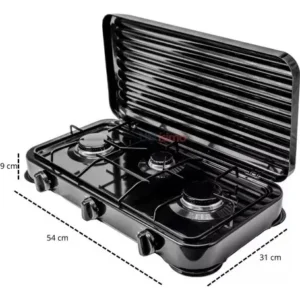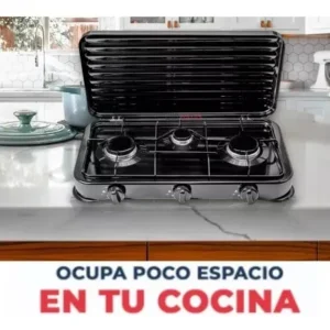 Cocina encimera de 3 hornillas ideal para camping, departamentos o uso como estufa auxiliar. Diseño compacto y resistente, perfecto para espacios pequeños o cocinas móviles.