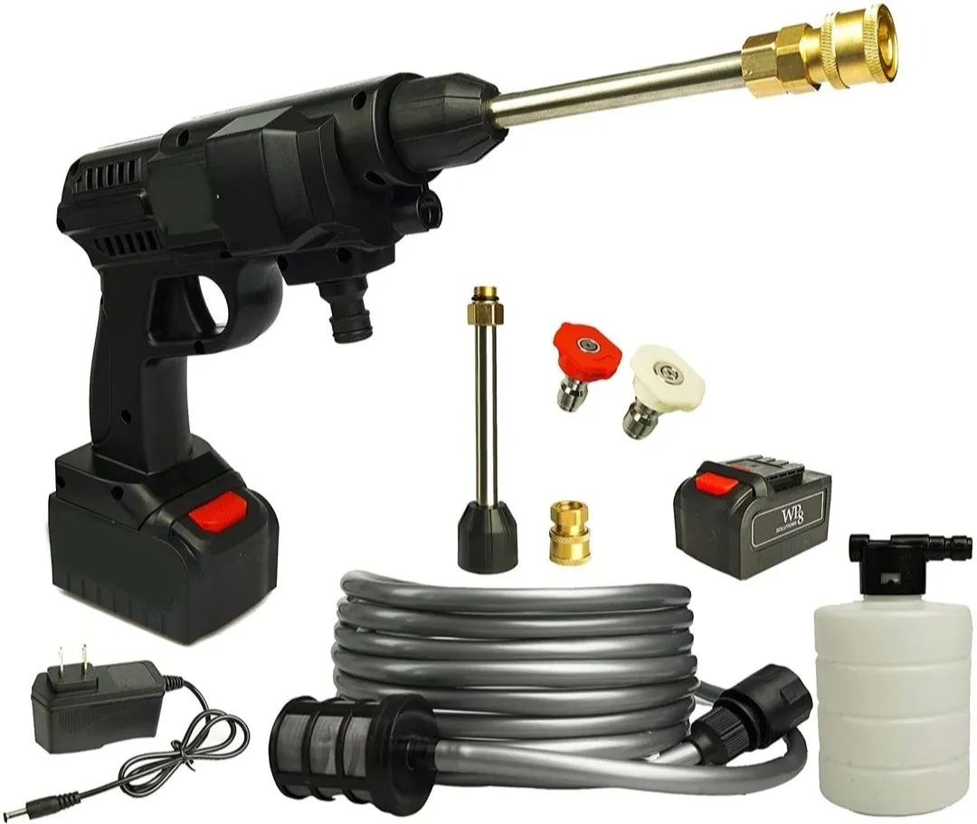 Potente lavadora a presión portátil con batería de litio de 24 V con motor de cobre; cuerpo de pistola de pulverización de agua inalámbrica ligera y compacta con filtración de 5 m de largo, manguera de jardín que permite extraer cualquier fuente de agua dulce para una limpieza y mantenimiento al aire libre sin esfuerzo. Doble filtración profunda de impurezas en protección del agua prolongar el tiempo de servicio de las máquinas. Con una cantidad perfecta de presión es ideal para trabajos de limpieza más pesados pero rutinarios; como desengrasante de limpieza de la cubierta de lavado de coches o riego de jardín, etc.